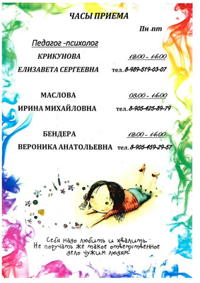 1. Педагог-психолог МАОУ "Школа №77" Крикунова Елизавета Сергеевна телефон +7 989 519-03-07