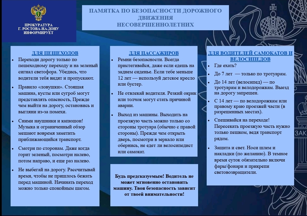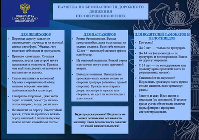 Прокуратура города Ростова-на-Дону информирует! Памятка по безопасности дорожного движения несовершеннолетних.